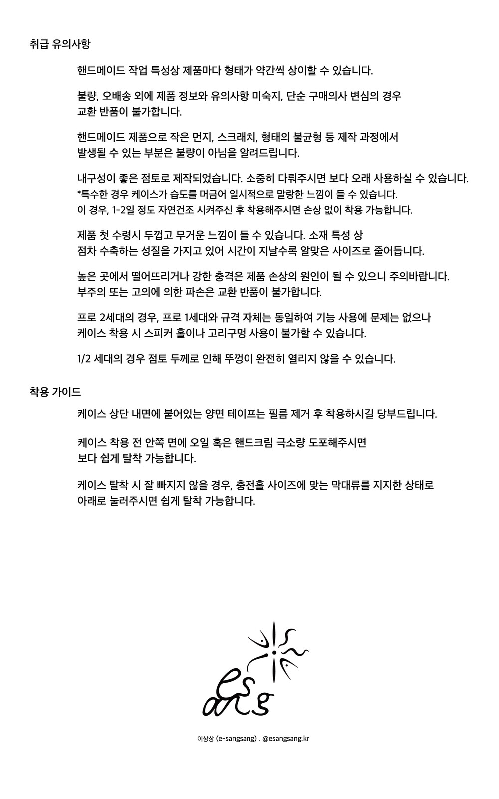 - 에어팟 케이스의 경우 1:1 오더메이드 제품으로 유의사항 미숙지, 기종 주문 실수로 인한 교환/환불이 불가합니다.